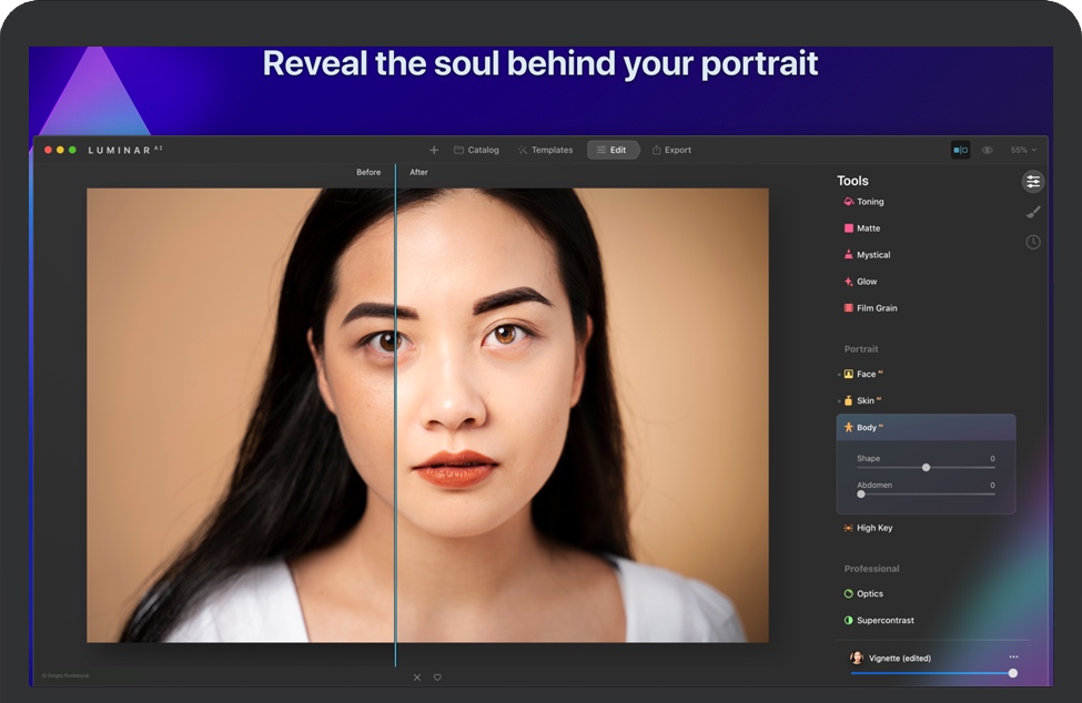 使用革命性的工具增强肖像的自然美感-无需遮罩。Iris AI使您可以单击更改眼睛的颜色。选择自然色或创意奇特的东西,直视您的灵魂。身体AI使身体达到完美状态,并在需要时增加或减轻体重。FaceAI可以照亮并瘦脸,消除黑眼圈和红眼,改善唇色,修饰眉毛,甚至还能做更多。