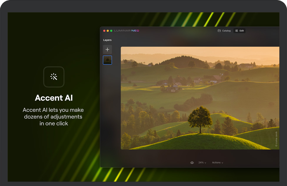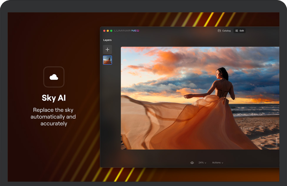 依靠具有 20 多种独特照片效果和编辑功能的 AI 照片编辑器。您可以通过单击来增强风景、修饰肖像、删除不需要的细节,甚至可以通过完整的场景重新照明来改变天空。