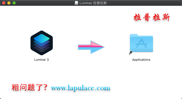 1、软件下载完成后,打开软件包如上图,拖动软件【Luminar 3】到 Applications 进行安装。
