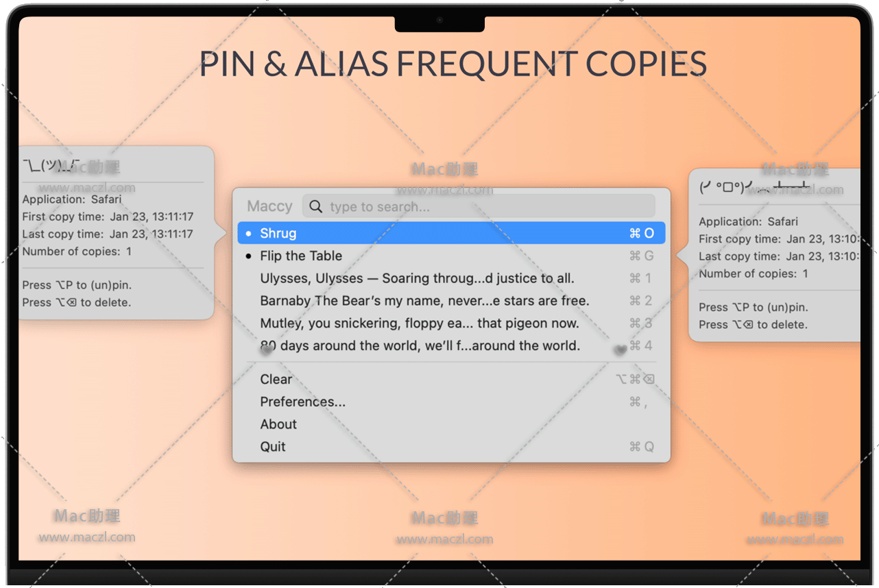 无干扰与其他 Mac 剪贴板管理器不同,Maccy 的功能非常单一——保存您的复制历史记录并让您快速访问。您不会被不必要的功能所困扰。 |
