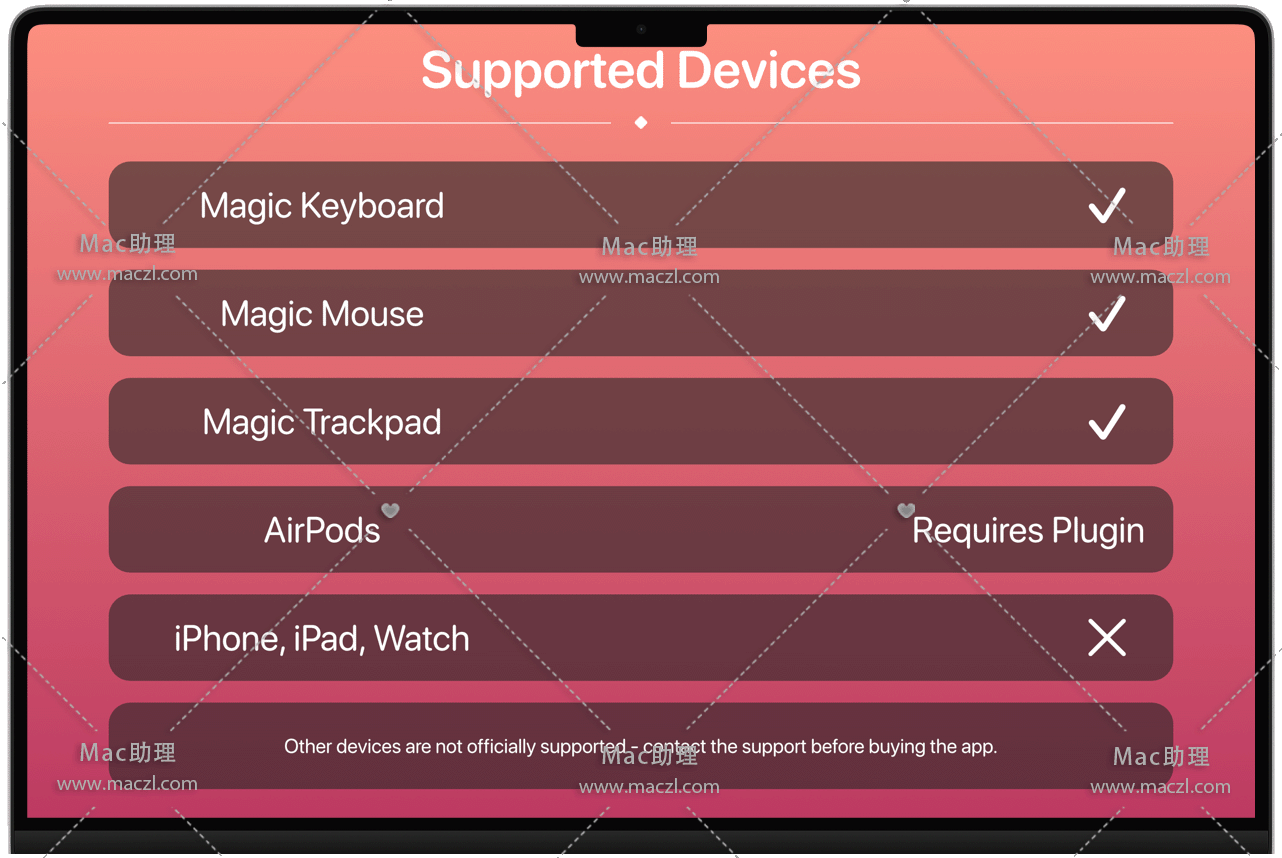 App Magic Battery在菜单栏中显示支持的输入设备和通过蓝牙连接的耳机的电池电量。也支持内置电池。