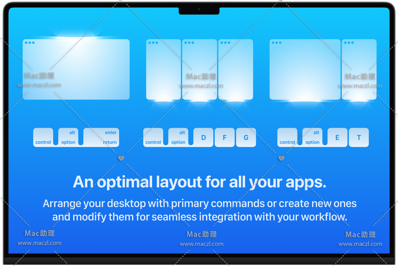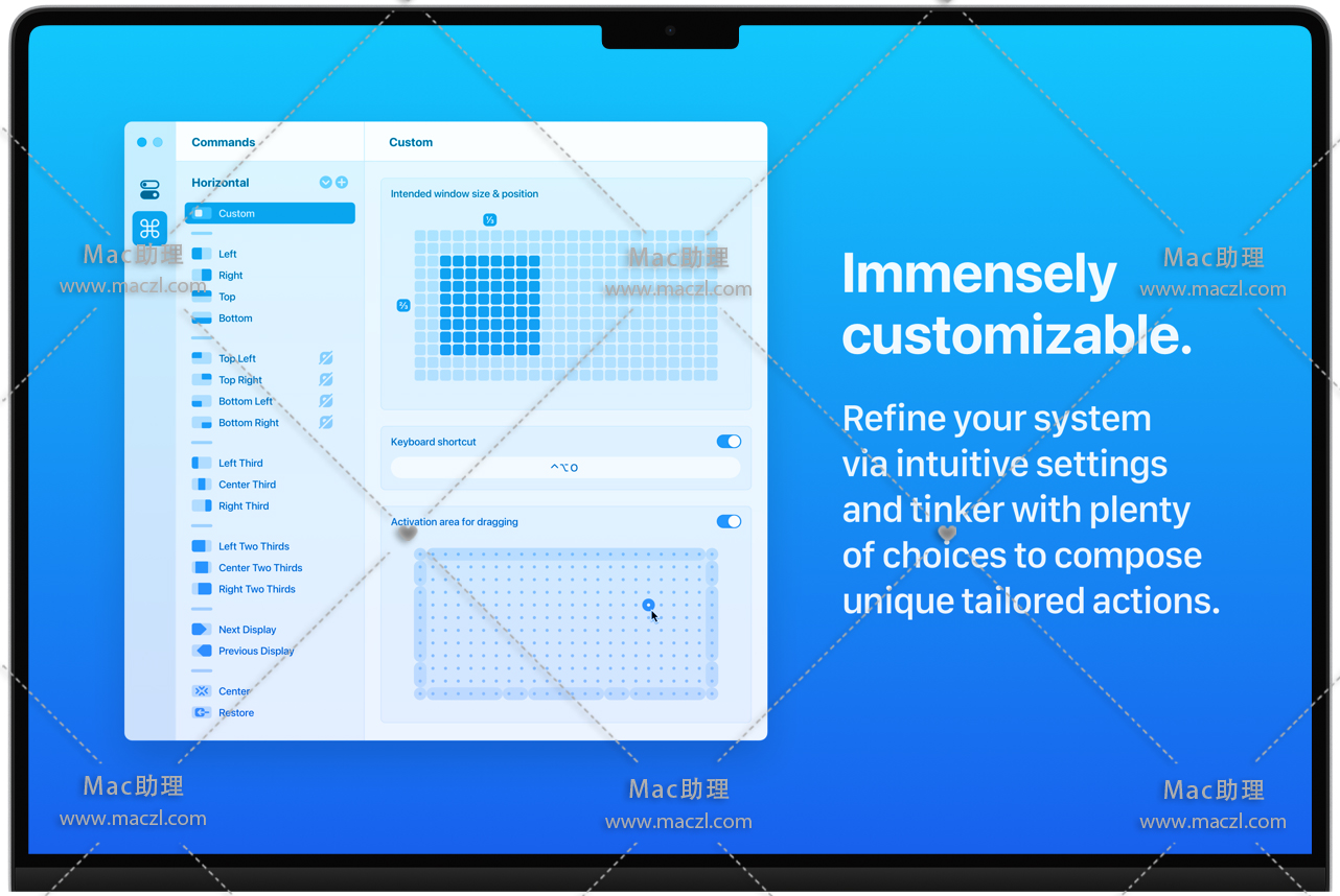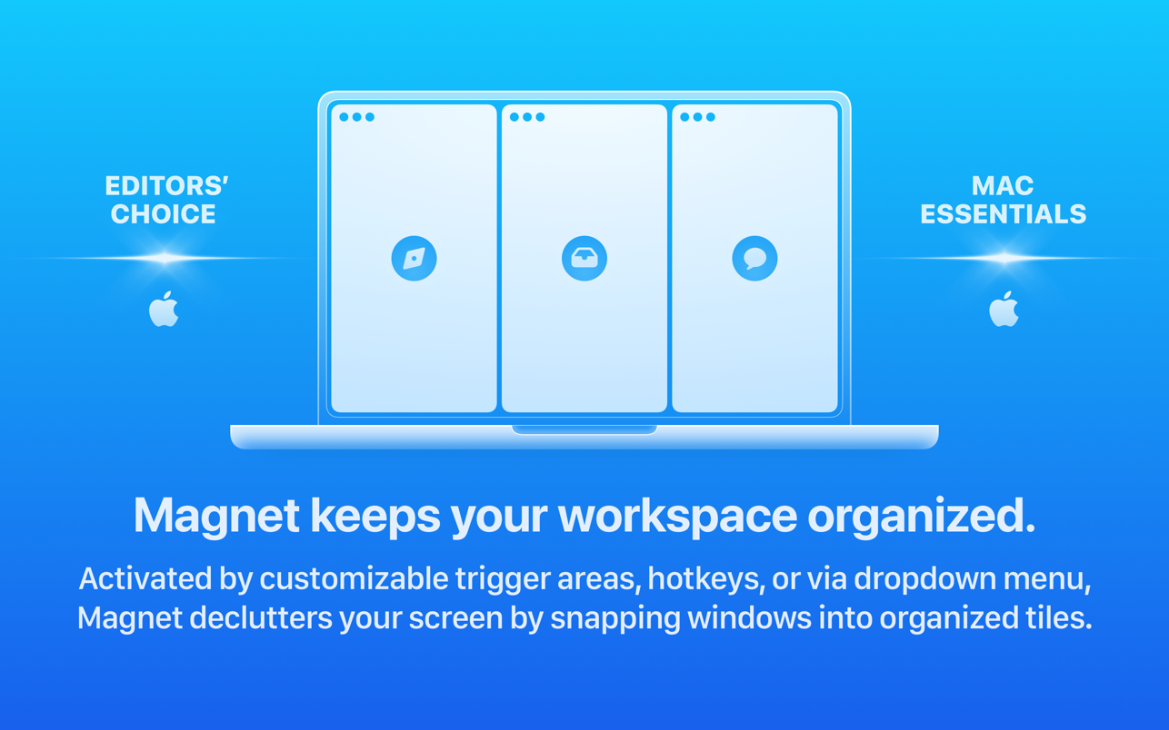 Magnet for Mac 让你的工作空间井然有序,通过拖动、自定义键盘快捷键或菜单栏激活,Magnet 会将macOS窗口对齐为有组织的图块,从而使您的屏幕变得整洁。复制、比较、多任务。多个窗口整齐地并排排列可消除应用程序切换并大大增强多任务处理能力。工作空间各异,但 Magnet 却能统领一切。全屏、二分屏、四分之一屏和三分之一屏。最多支持 6 个外部显示器。潜在组合无穷无尽。
