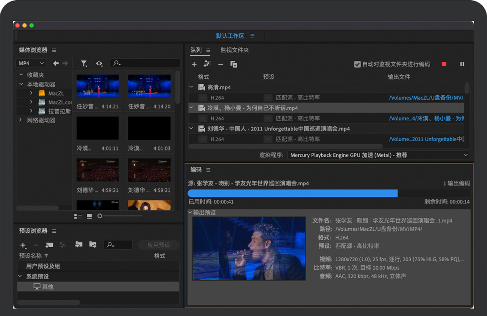 预设浏览器 - 使用预设浏览器立即访问常用设置。按类别组织预设,设置收藏夹,以及自定义最常用的编码预设。