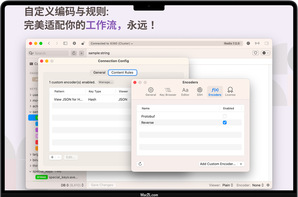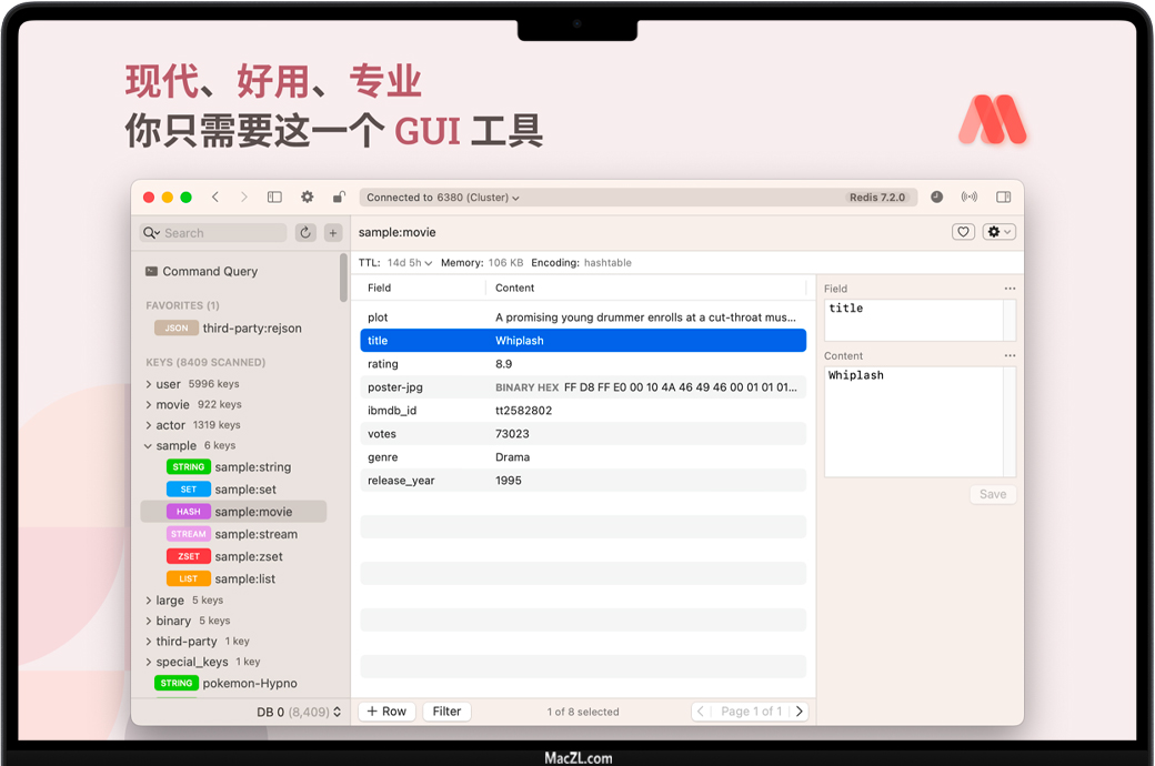 Medis 对字符串、列表、哈希、集合、排序集合、流,甚至一些第三方模块(如 RedisJSON)都提供了专门的支持。通过漂亮的用户界面,用户可以愉快地管理所有数据。