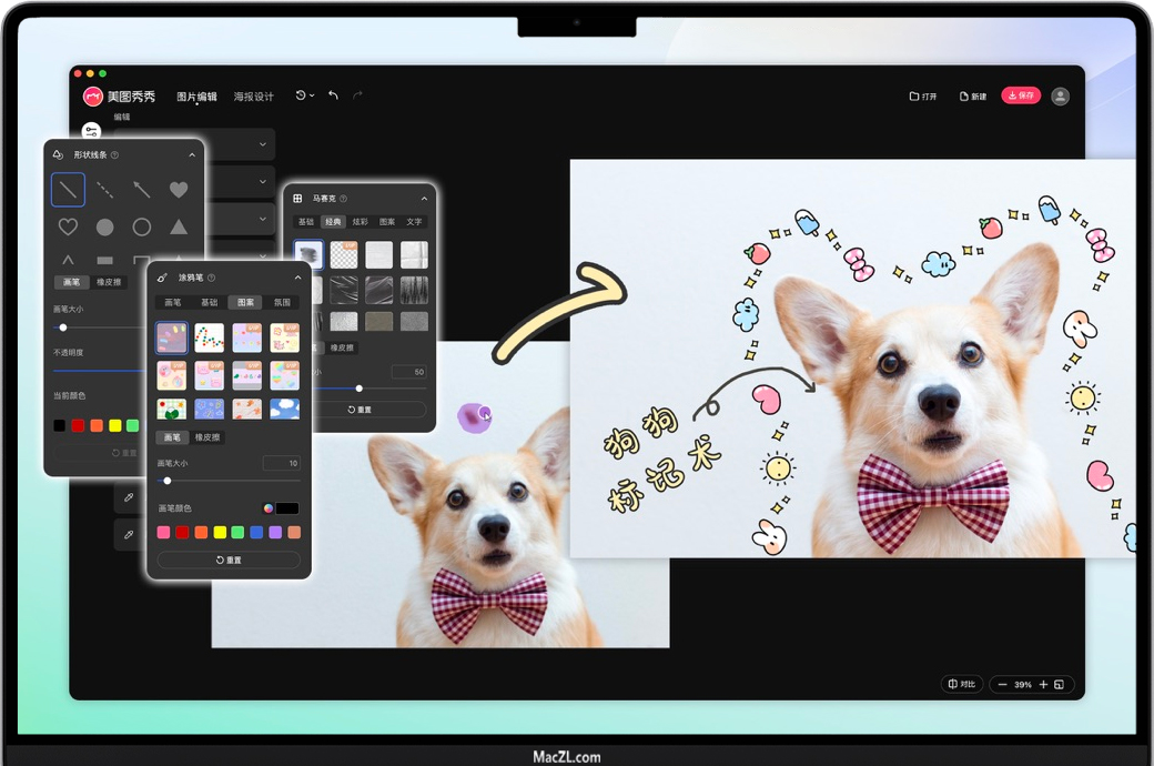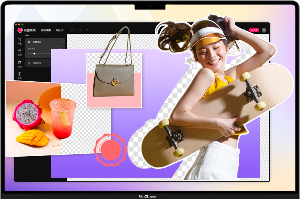 美图秀秀 for Mac 是一款图片编辑与办公设计工具,是海报模板、智能抠图、人像美容、拼图等专业功能,简单好上手!生活办公都能用的美图秀秀,功能专业,操作简单,设计小白、专业设计师皆可快速出图。多场景修图设计,可处理生活/工作照片,制作电商/微商产品图、营销带货宣传海报;自媒体社交平台配图、封面、拼图晒照;企业节假日通知/招聘求职/通知公告/喜报晒单;考试证件照等多场景图片和海报。