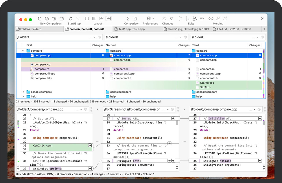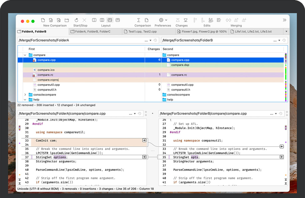 无论您是在处理文本文件的多个修订版,还是需要保持多个文件夹层次结构同步(例如,在台式机和笔记本电脑之间),Merge 都可以帮助您快速准确地工作,从而节省时间并减少错误。