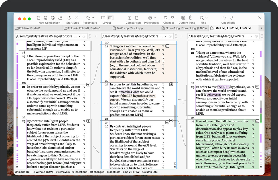 Araxis Merge Pro for Mac 是一款支持两路和三路可视文件比较/合并和文件夹同步应用程序。使用它来比较、理解和组合不同版本的源代码、网页和其他文本文件,甚至是从另一个应用程序(例如,Pages或Microsoft Word)复制和粘贴的文本。Araxis Merge与Time Machine集成,因此您可以比较旧版本的文件。