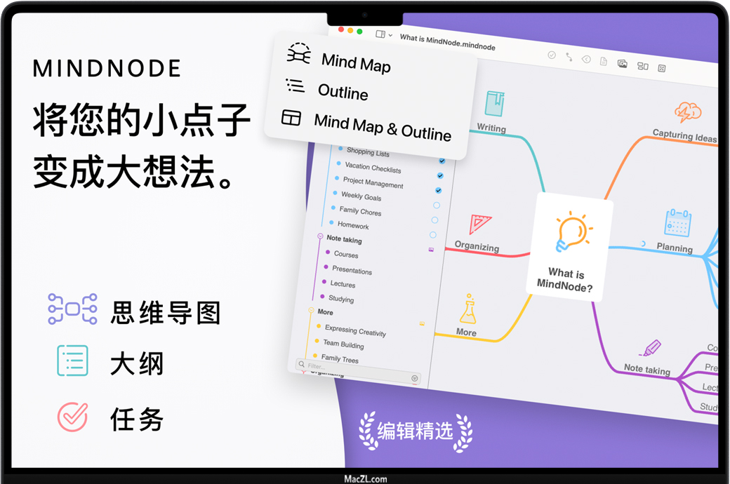 每个伟大的创意都始于一个想法。然后又一个想法。再然后是千百万个想法。MindNode 是面向 Mac 和 iOS 的最实用的头脑风暴应用。它能帮助您捕捉想法,以清晰的图片记下自己的构思。