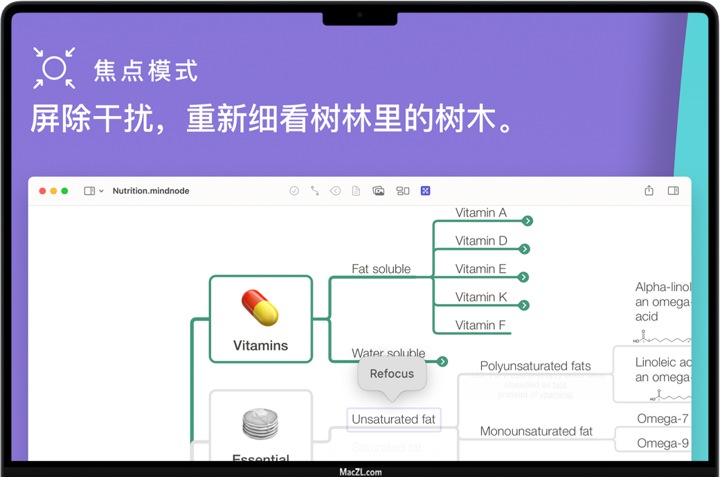 使用 MindNode,通过各种操作捕捉您的想法,例如编辑、重新排列、折叠节点以及导入和导出文件。