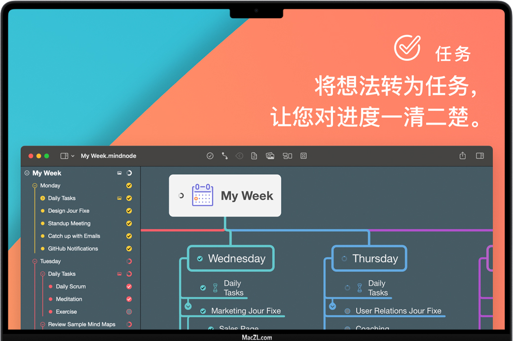 它可以将您的想法转换为任何形式,无论是文字、图片、链接、任务还是注释。为井然有序的分层视图创建大纲,见证思维导图的诞生。使用思维导图,以视觉形式重新组织节点,添加新想法。MindNode 是一款能够逐步呈现您想法的理想工具。