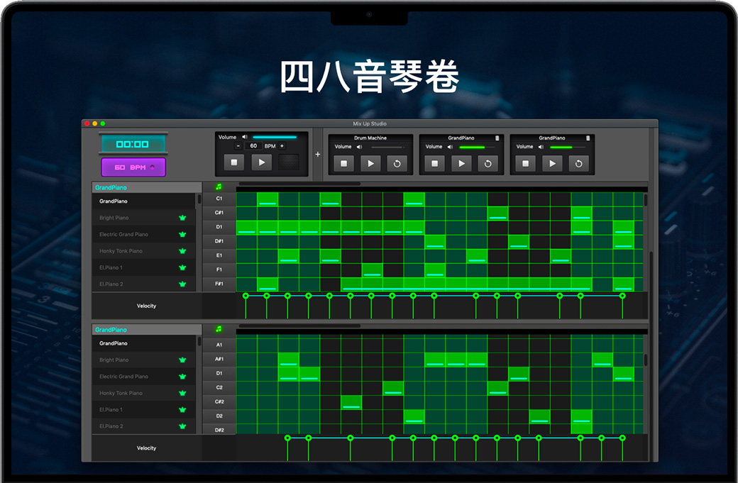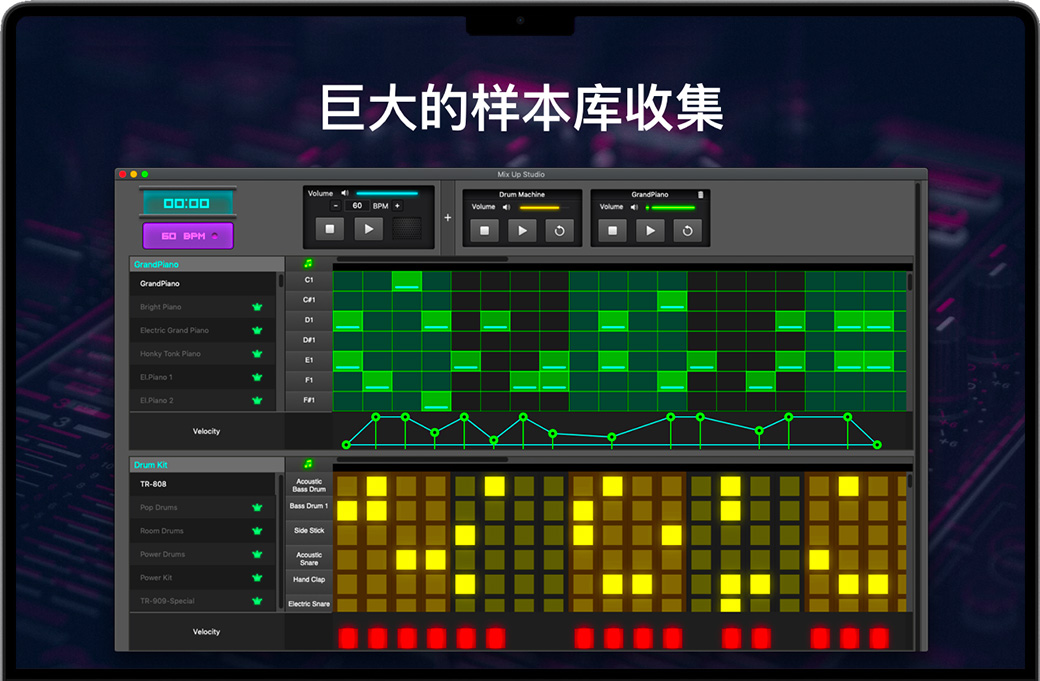 Mix Up Studio for Mac 中午名叫做:混音工作室,是一款适用于macOS的电子音乐制作软件。现在你的Mac里拥有完善的录音室,可以随时随地创建曲目,发挥创造力,甚至将最勇敢的想法变为现实。Mix Up Studio提供多种乐器:选择最合适的乐器,并使用音序器编写其部分音效和滤镜集合从集合中应用不同的音效和过滤器,为音乐添加创意节拍器不要弄乱节奏!Mix Up Studio还包括节拍器功能,使您的创作更加和谐易于使用通过全面的教程和简单的界面,您将很快掌握此应用程序。