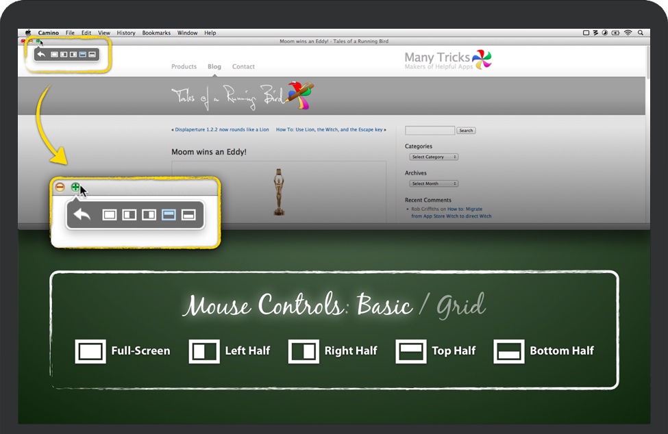 抓取一个窗口,将其拖动到边缘或角落,然后释放鼠标。您可以在Moom的首选项中为每个位置设置调整大小的动作。