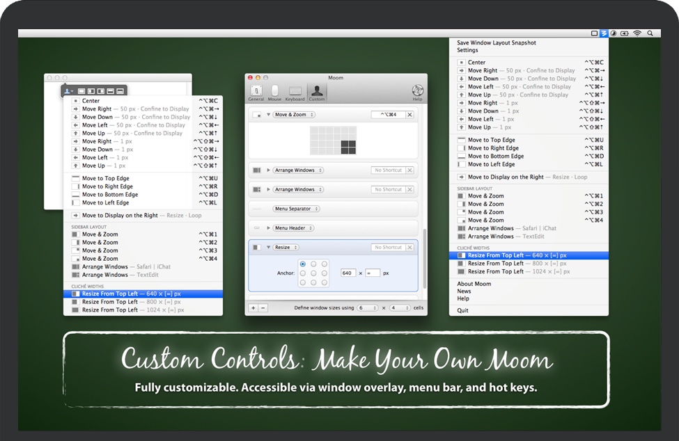 通过Moom菜单栏图标,绿色按钮的弹出调色板或键盘快捷键可以访问自定义命令。