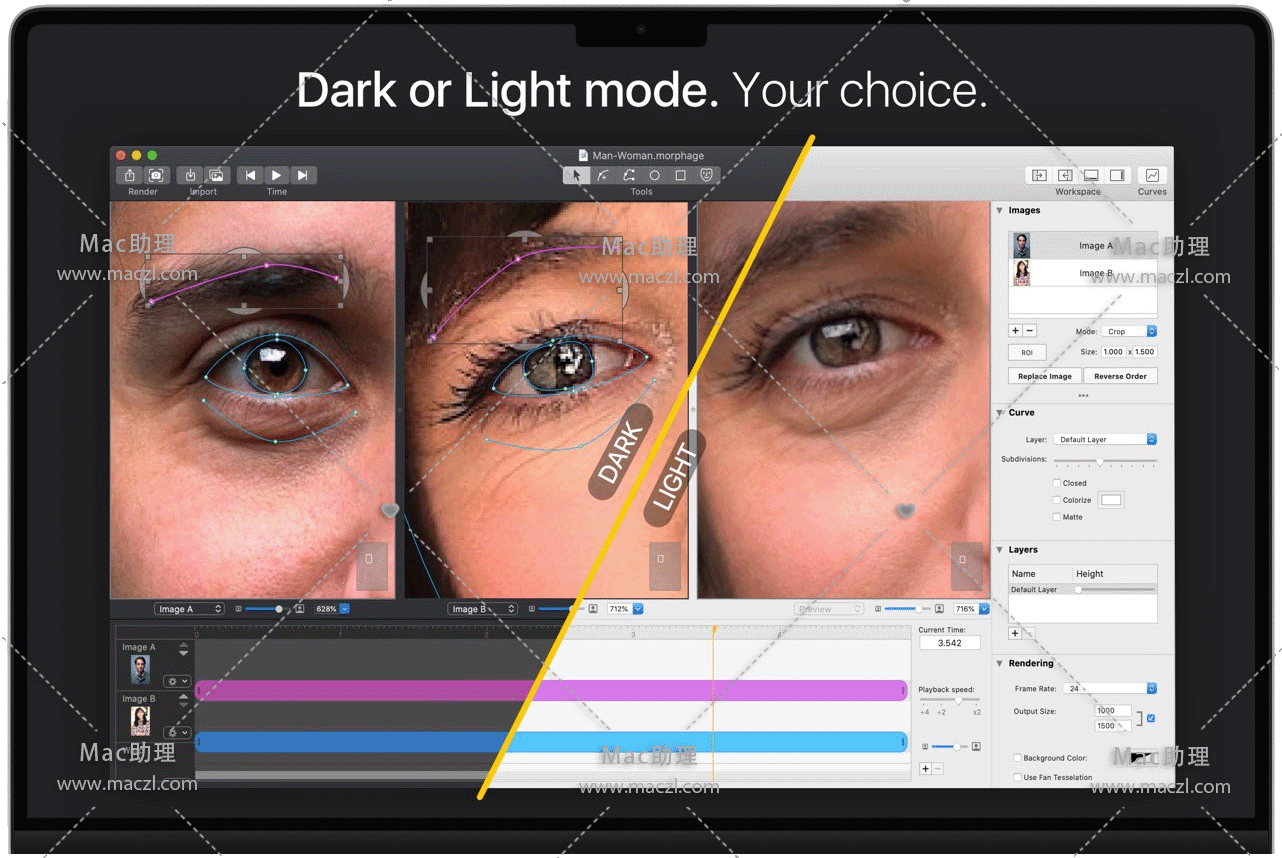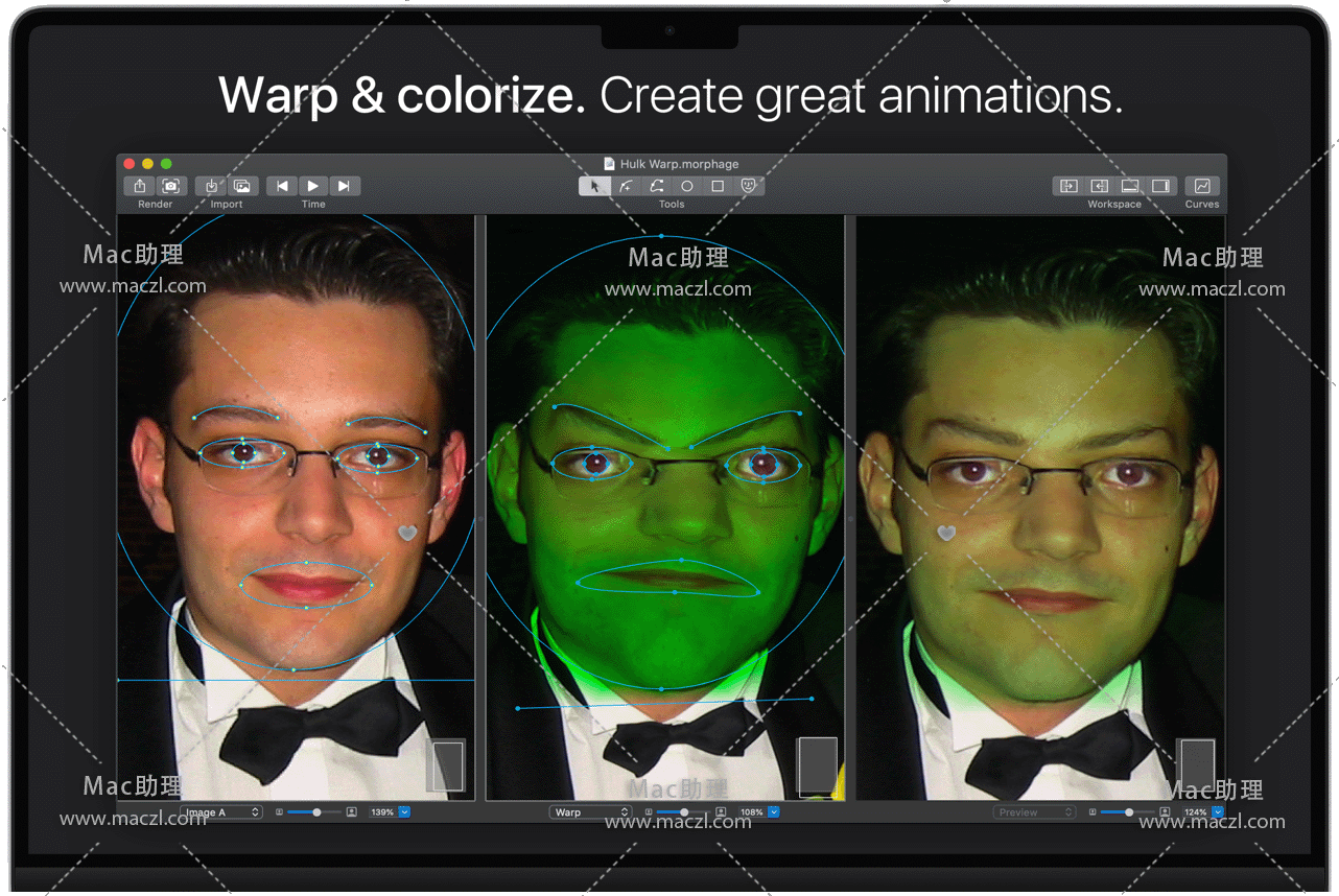 Morph Age for Mac 是一款macOS上创建变形和扭曲动画应用程序。使用“Morph Age”,可以从两个或多个图像创建变形动画。定义每个图像中匹配特征的曲线(例如,在面部变形的情况下,眼睛、鼻子、嘴巴的轮廓),并实时预览更改。如果对结果满意,可以将变形导出为电影或多个图像。可能性几乎是无限的!变形人脸,动物,人对动物,物体…