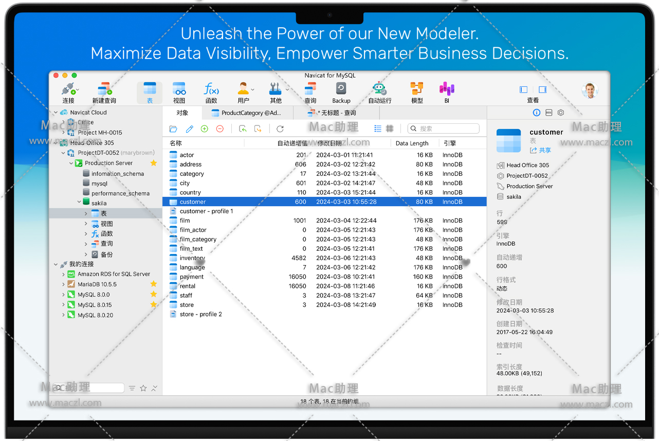 Navicat for MySQL 是管理和开发 MySQL 或 MariaDB 的理想解决方案。它是一套单一的应用程序,能同时连接 MySQL 和 MariaDB 数据库,并与 OceanBase 数据库及 Amazon RDS、Amazon Aurora、Oracle Cloud、Microsoft Azure、阿里云 PolarDB、腾讯云和华为云等云数据库兼容。这套全面的前端工具为数据库管理、开发和维护提供了一款直观而强大的图形界面。