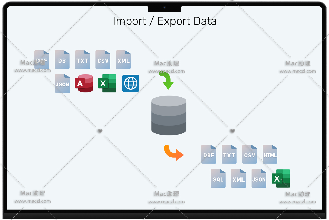 将数据从各种格式导入数据库,或在设置数据源连接后通过ODBC连接导入。将数据从表、集合、视图或查询结果无缝导出为Excel、Access、CSV等流行格式。