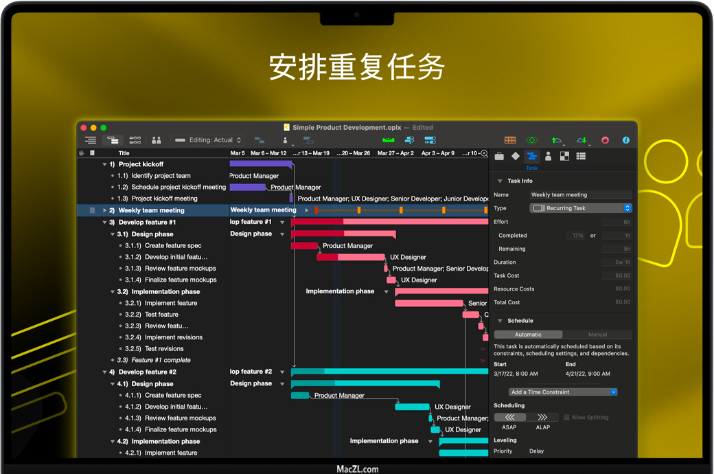 - 自动工作量估算 [新增!]:让 OmniPlan 针对各种情景分配最佳和最差估算。