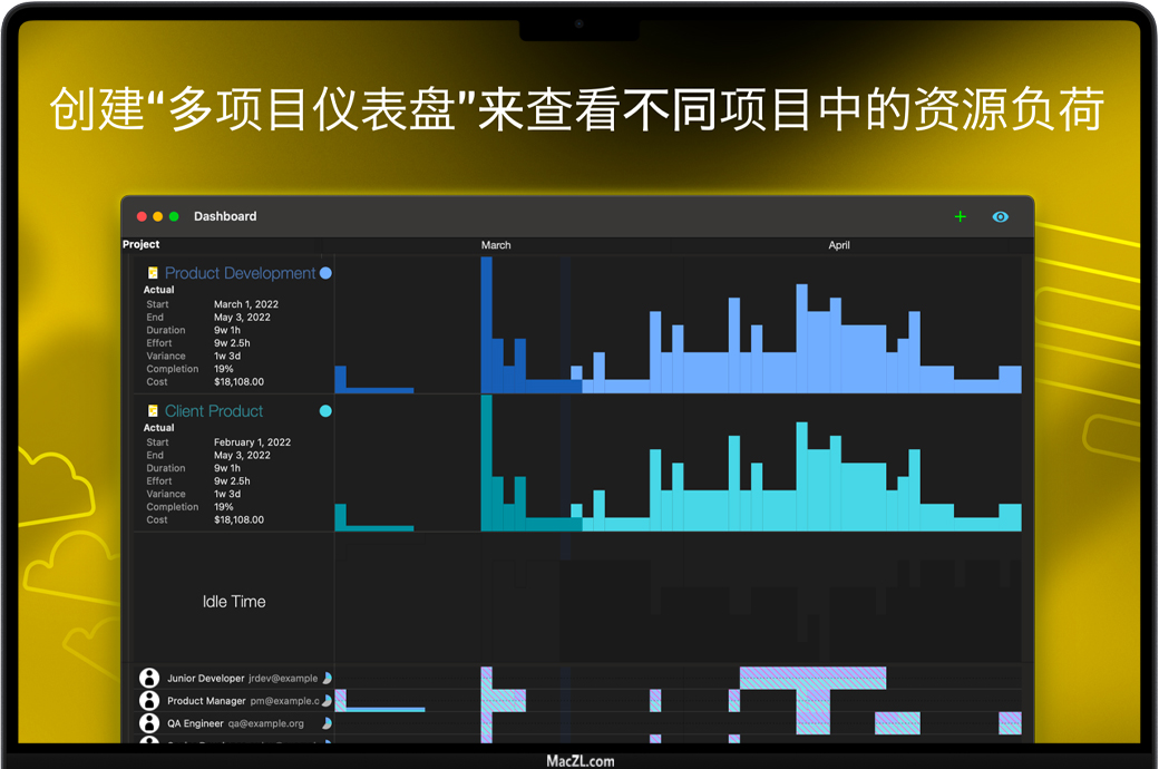- 多项目仪表盘 [新增!]:构建一块赏心悦目的仪表盘,让项目状况一目了然,并了解任何团队成员的工作安排是紧张还是空闲。