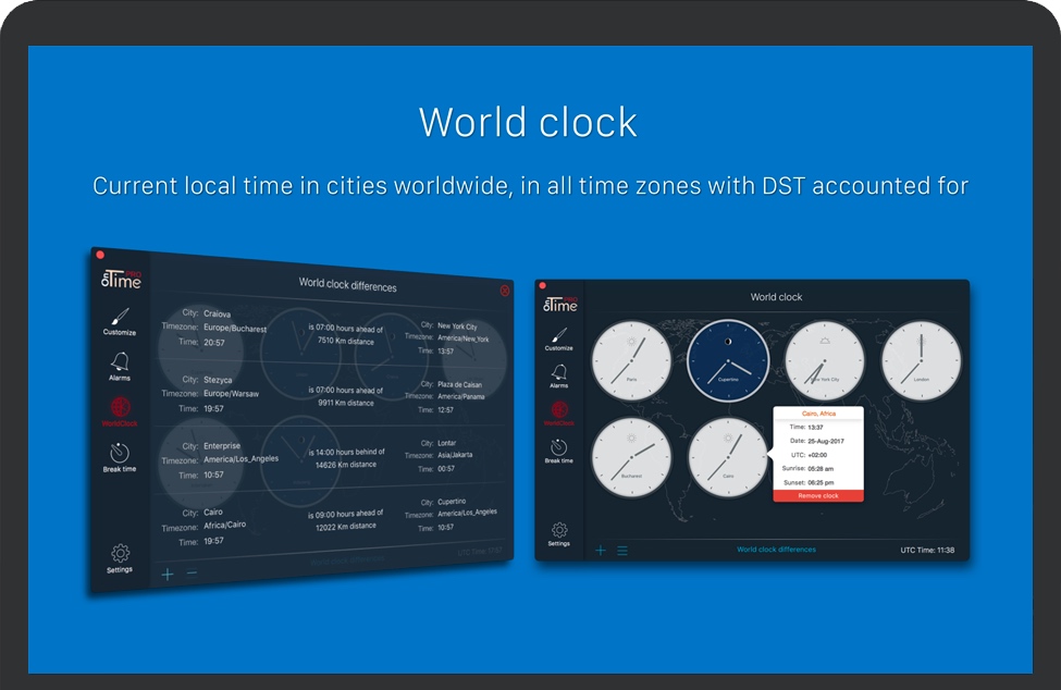 OnTime PRO for Mac 是您永远需要的一款不可或缺的时间工具。使用直观的界面,您可以为您的桌面创建无限漂亮和有用的时钟。永远不要忘记您需要做的重要事情:使用闹钟功能,您可以根据需要轻松添加任意数量的闹钟。使用世界时钟查看世界任何角落的每一刻时间。OnTime PRO甚至会告诉你在工作时休息一下,以提高工作效率。