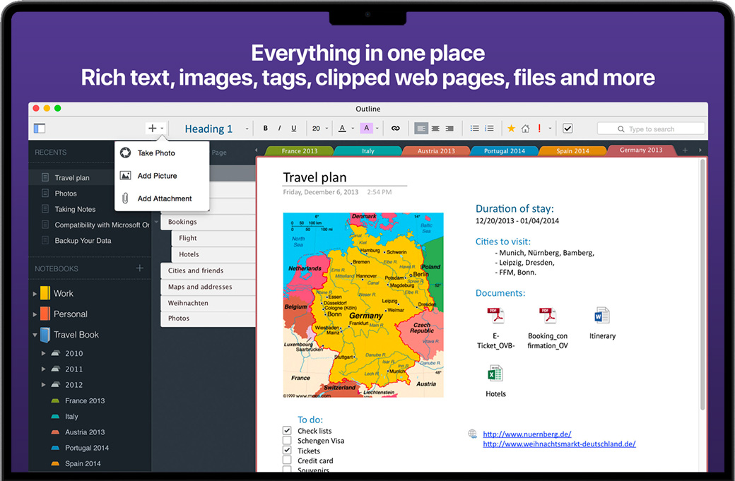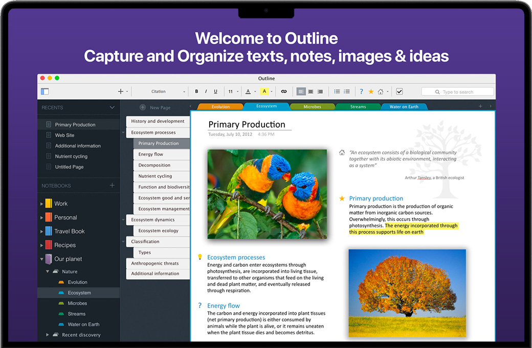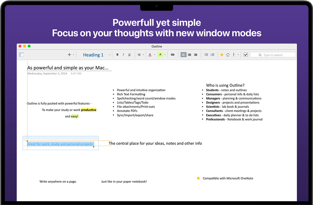 Outline是用于macOS的直观笔记应用程序,具有类似于真实纸质书的便捷结构:笔记本,小节,小节和页面组可帮助保持笔记的顺序,而不管其复杂性如何。 Outline非常适合学生,教师,医师,律师,执行官以及日常生活中涉及各种笔记的每个人。它可以与iPad版Outline和Microsoft OneNote,使笔记成为多平台。 享受笔记在页面上的任何地方键入。就像在一个好的旧纸质笔记本中一样,您可以按自己的方式进行操作,而无需使用任何工具!限制已成过去:随着想法的增长,在画布中填充您的想法,无论它们位于何处。 整理数据Outline的完美组织直观地描绘了您的想法的层次结构。在笔记本中创建页面,部分和部分组,并根据特定主题对其进行自定义。您不会迷路,但对这种结构的简单性感到满意。 使您的笔记很棒使用各种格式:更改字体大小和颜色,应用样式和突出显示,创建编号和项目符号列表,表格和超链接。使用相关图标可视化您的笔记-添加标签,创建待办事项列表,不要错过任何东西。 附加文件并插入打印输出要在一个地方收集相关文档,请将它们添加为文件附件。PDF文件可以作为注释的打印输出插入。这样,Outline成为用于存储和处理数据的通用工具。 保护您的笔记敏感数据值得特别注意和安全。您可以选择在本地或您喜欢的云中使用Outline存储数据的位置。部分密码保护将使用行业标准的加密算法来确保您的信息安全。您可以精确控制何时自动锁定受保护的部分。 使用iPad版Outline进行移动通过这款精美而强大的iPad应用程序获得桌面级体验。您会在较小的外形尺寸中找到相同的功能。不要忘记尝试墨水! 与Microsoft OneNote一起使用大纲可用于iPad或Mac上的本地OneNote文件。您还可以与OneDrive或Sharepoint同步,以与使用OneNote的同事进行笔记协作。