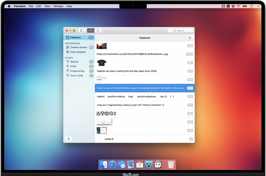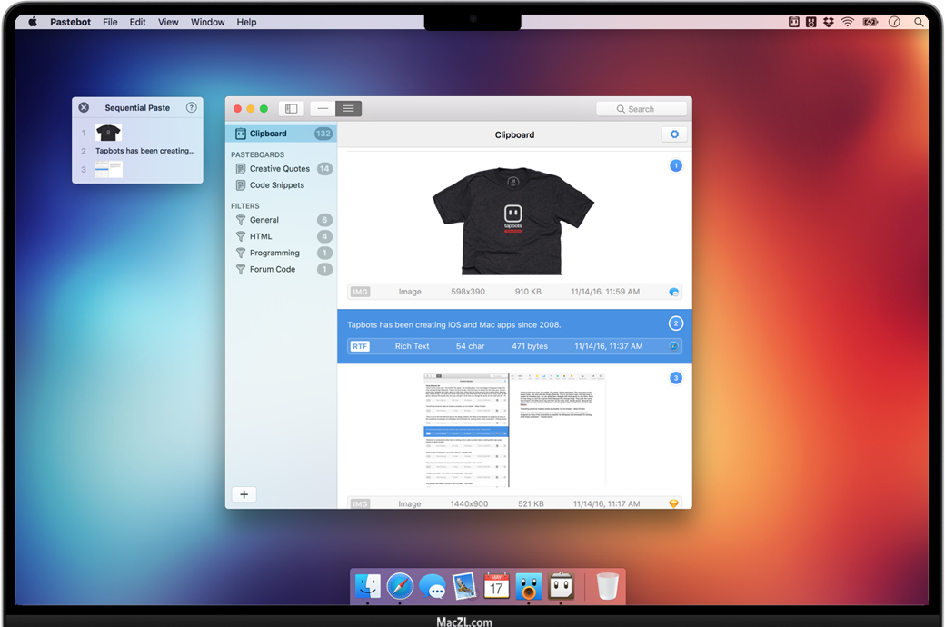 Pastebot在需要时就在那儿,不需要时就不可见。可以从任何应用程序快速访问您的剪辑,并在粘贴之前搜索,预览或过滤剪辑。您甚至可以设置剪裁顺序以按顺序粘贴。