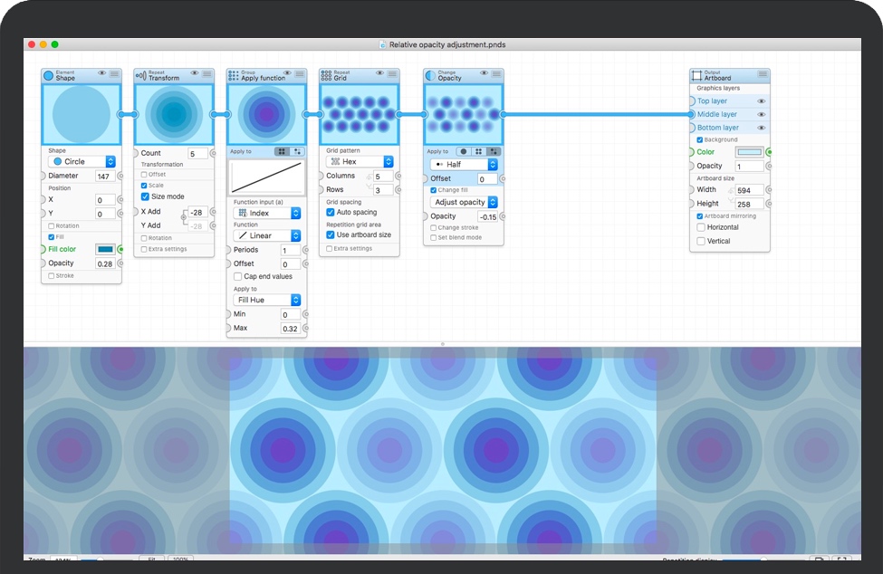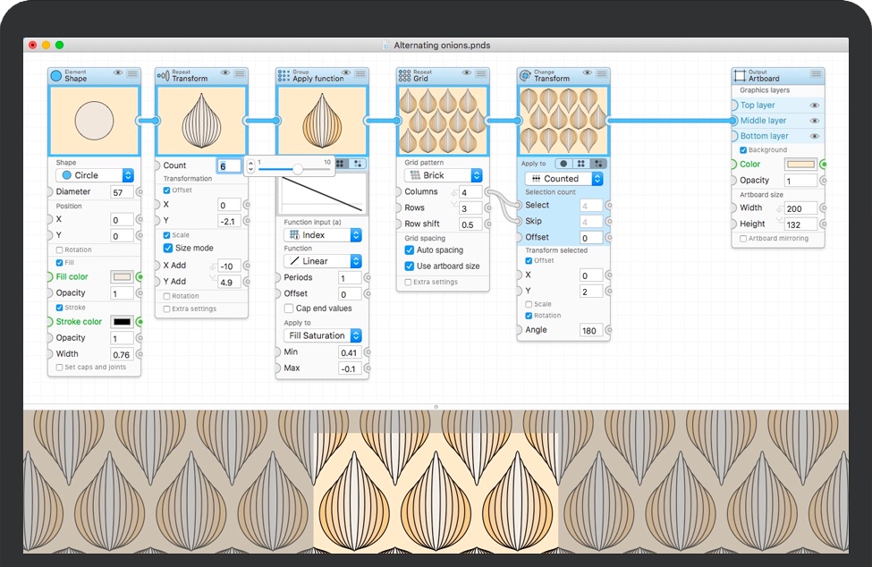 从一开始就设计Patternodes,以激发好玩的使用和实验。因此,结果始终显示在预览视图中,并重复进行模式和实时更新。