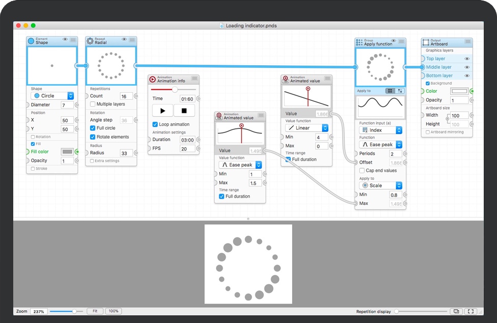 Patternodes for Mac 是用于创建图形矢量图案,动画或插图的工具。这是使用基于节点的界面完成的,在该界面中您可以定义一系列描述设计的连接节点,每个节点代表图形元素,更改或重复。您可能将其称为2D应用程序的一种参数化设计或可视化脚本。