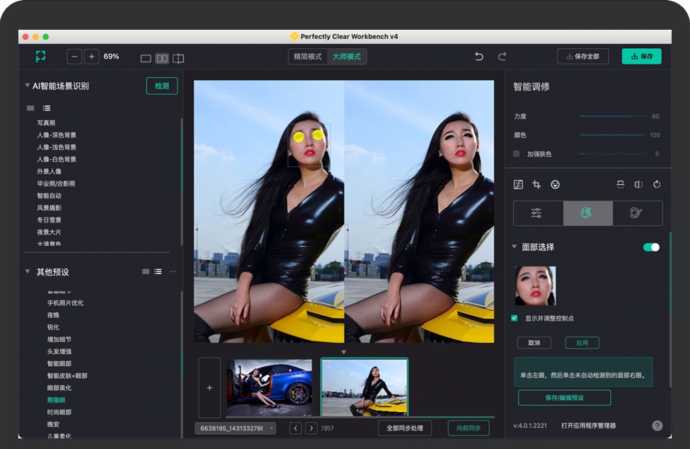 完美的肌肤和眼睛这项预设技术非常适合婚礼和肖像润饰,为最自然、最真实的外观创造逼真的效果。去除黑眼圈,增强眼睛,调好肤色,瘦身面部,添加粉底,自动模式面部色调只是几个能在短时间内展现任何主题自然美的方法 |