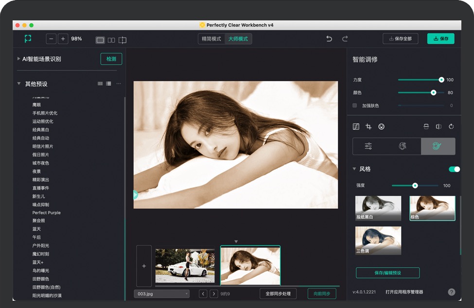 省时预设使用Perfectly Clear强大的一键预设,让编辑保持简单,旨在节省您的时间,同时仍然允许完全控制,以便使用强度滑块轻松优化整体外观。为你最常用的编辑工具创建并保存个人最喜欢的预设! |
