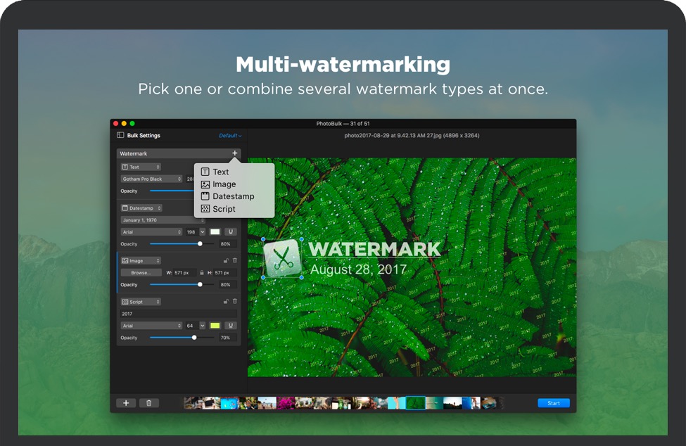 批量水印允许您使用多种选项,轻松快速地将多个水印添加到多张照片中。使用标签、徽标或任何其他个人标记定制您的照片。使用精确控制器将水印放置在任意位置,然后直接在实时预览框中将其旋转到所需的角度!
