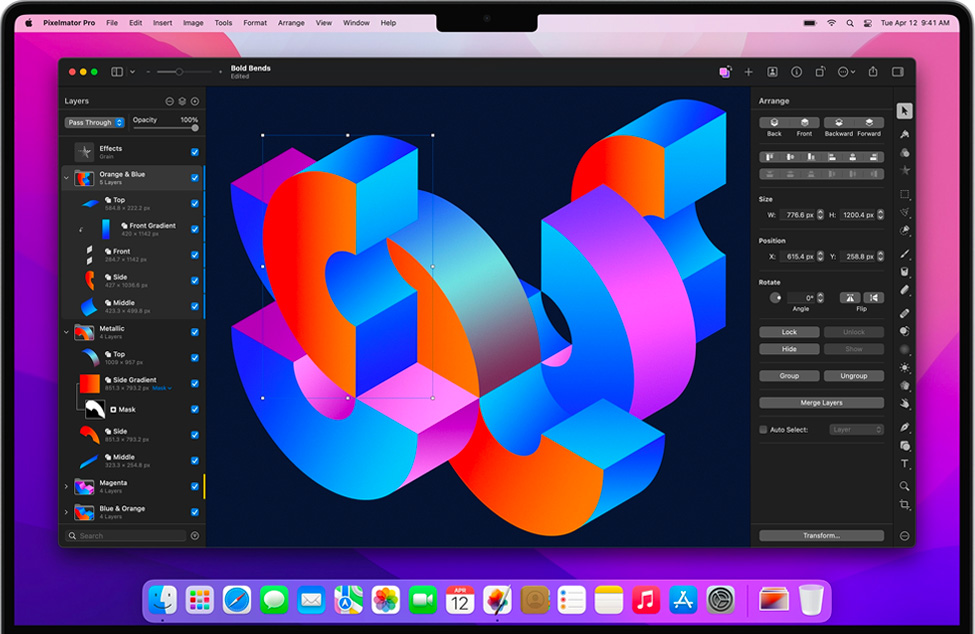 机器学习增强的图像编辑兼容性打开和编辑所有最流行的图像格式,包括 JPEG、TIFF、PNG、PSD、HEIF、SVG、PDF、GIF、BMP、TGA 以及 JPEG-2000 打开和编辑带有图层的 Photoshop 图像 打开和编辑 SVG 矢量图 直接从“照片”应用启动 Pixelmator Pro,并将编辑内容保存回图库中的原始图像 将您的图片从 Pixelmator Pro 中直接分享到照片、邮件、AirDrop 和其他地方