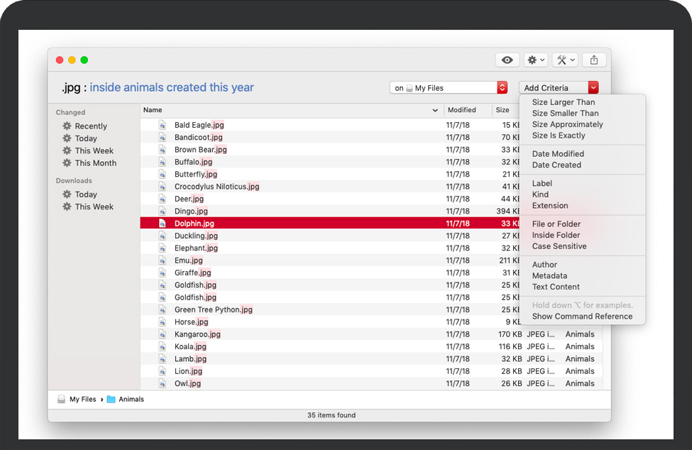 自然语言搜索查询。 无限的搜索结果。 在不可见的文件夹和包中搜索。 搜索任何磁盘类型:Mac、Windows、服务器等。 轻量级UPNP/DLNA媒体服务器(需要macOS 10.14或更高版本)。 媒体服务器支持:预定开始/停止、索引、最近项目和系列剧集排序。 文本内容搜索文本文件、PDF 文件和 Microsoft Word 文档。 显示磁盘活动。实时查看所有磁盘上正在修改哪些文件。 可用时使用基于内核的搜索 (searchfs)。 支持的搜索位置:家庭、mac 磁盘、本地磁盘、服务器、单个磁盘、打开的 Finder 文件夹。 搜索保存和历史记录。 搜索方式:名称、创建日期、修改日期、文件扩展名、标签、父文件夹、种类、正则表达式、通配符和聚焦元数据。 不包括的字。 哈希:md4、md5、sha1、sha224、sha256、sha384、sha512。(显示高级信息)。 应用程序名称、命令名称和关键字的自动完成。 文件路径的完整、非模糊显示,路径差异突出显示。 一两个搜索结果的大图标视图。 空间磁盘浏览(保存窗口位置、大小、滚动位置等)。 支持对找到的项目执行shell和AppleScripts。 突出显示找到的单词。 上下文菜单:共享、服务、打开、在 Finder 中显示、移至垃圾箱、获取信息、复制路径。 快速访问收藏夹(快速文件夹) QuickLook 预览。 支持暗模式(10.14 Mojave)。 拖放应用程序。 菜单栏图标开/关。 完全可配置的系统范围热键。 内置命令参考。