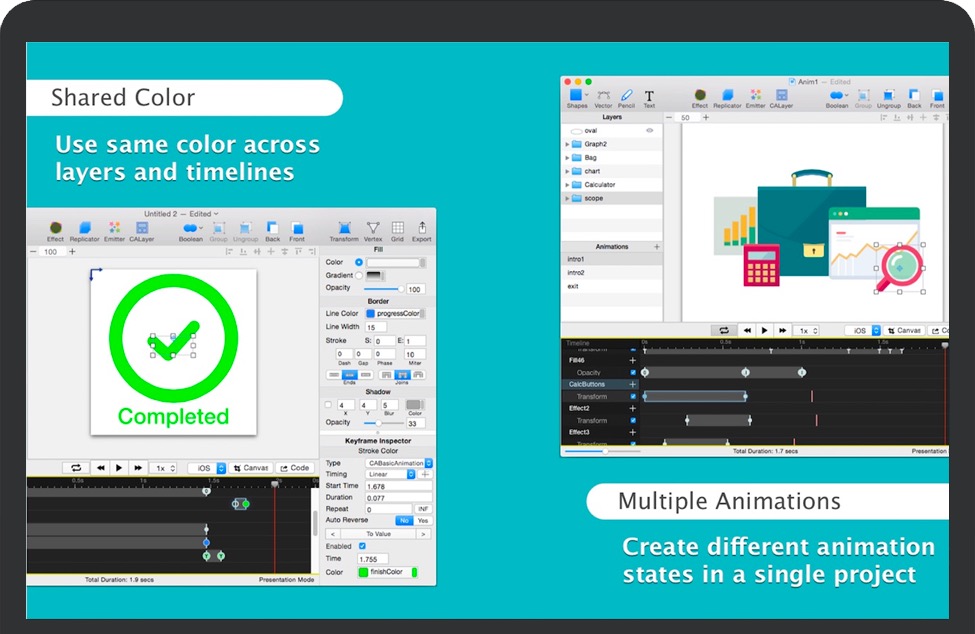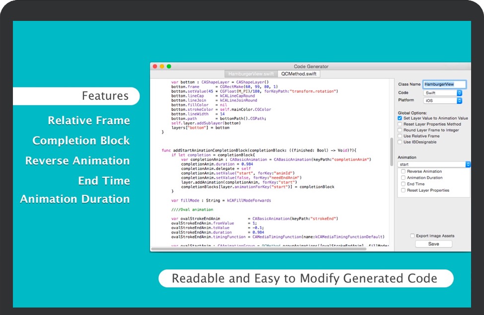 现在为您的iOS / OSX项目创建动画比以往任何时候都容易。只需更改任何属性即可;您将实时看到动画更改。使用QuartzCode,您可以在几秒钟内迭代任何动画,同时可以并行查看代码。在Xcode中创建动画的障碍已大大减少!