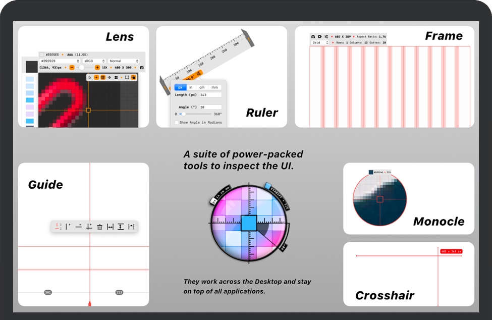 QuickLens for Mac 是Mac助理整理的一款非常专业的UI设计开发软件,作为UI设计/开发人员,你总是试图创造最好的接口,让您确保您的实现匹配设计!QuickLens Mac版为用户提供了一套工具,可实现放大像素、测量尺寸、样本颜色、检查校准等操作以及更多其他功能。