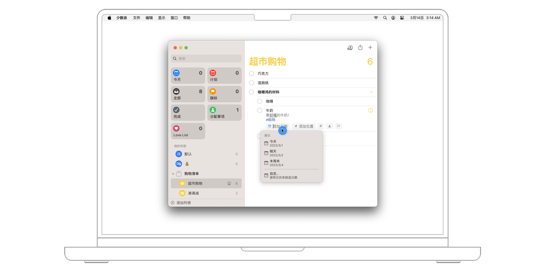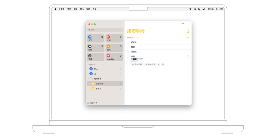 在应用的主界面,左边栏显示的是系统自带的五个智能列表:「今天」「计划」「全部」「旗标」和「完成」,以及你手动创建的列表。右侧则显示的选定列表里的所有任务。