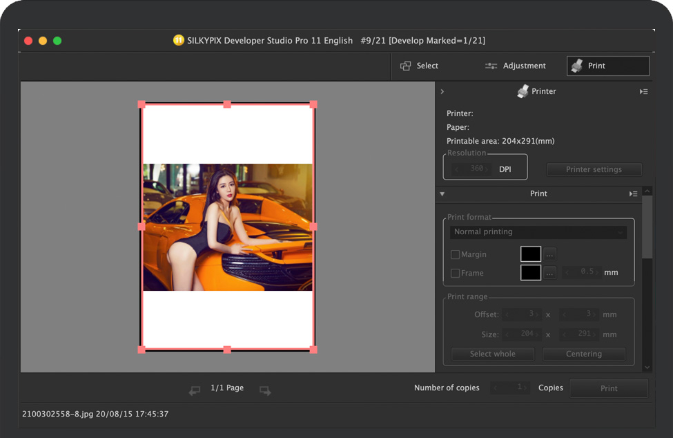 切换部分以适应目的您可以将主窗口的布局切换到三个工作区:“选择”用于选择图像,“调整”用于校正和调整图像,“打印”用于在查看打印结果的同时配置打印设置。根据目的切换部分,可以提高工作效率。 |