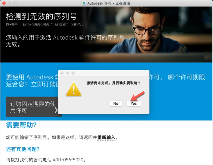 稍等一会,出现“检测到无效的序列号”提示,如下图,我们点击下面的“重新输入”几个字的按扭。