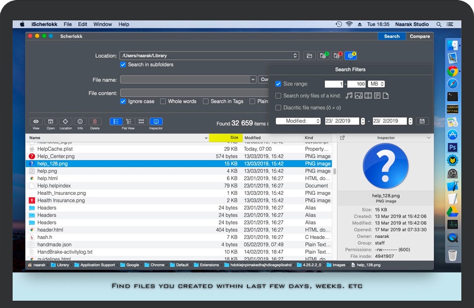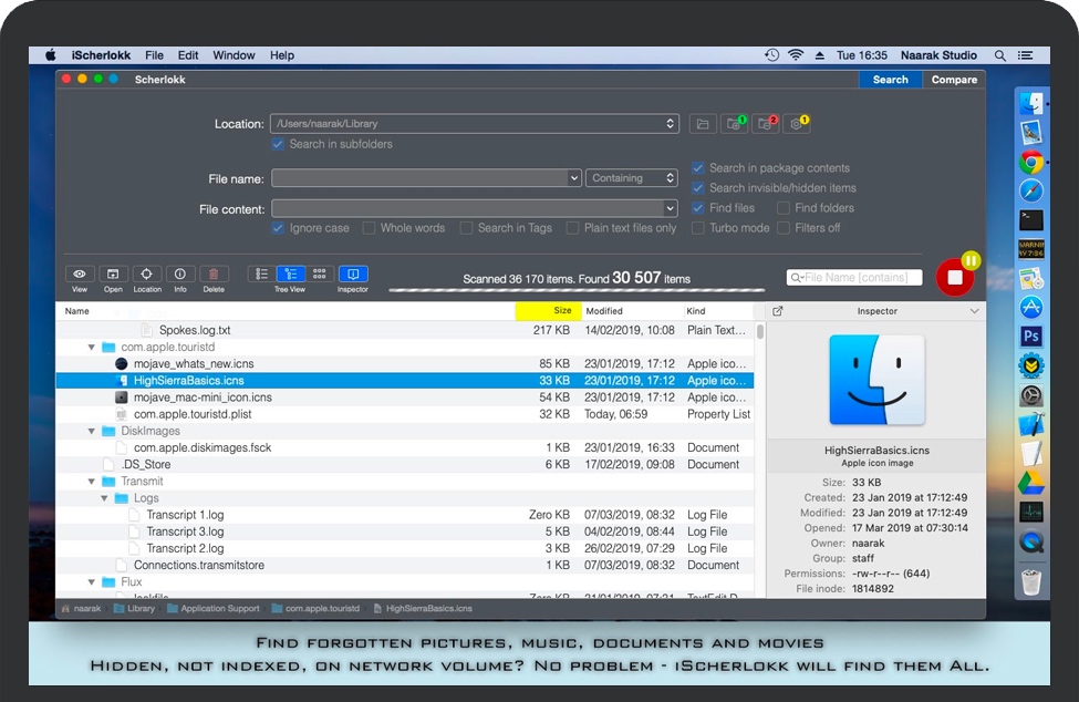 •iScherlokk搜索“真实”文件而不是Spotlight的索引。索引并不总是最新的,并且不包含所有文件。