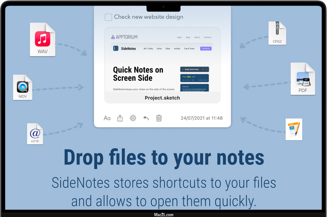 SideNotes for mac 是一款苹MacOS侧边栏笔记应用。它显示和隐藏在显示器的侧面,可以通过鼠标滑动到屏幕边缘呼出SideNotes,通过这种交互方式管理创建笔记将不会分散您的注意力,可以使笔记井井有条,大大提高您的作业效率。