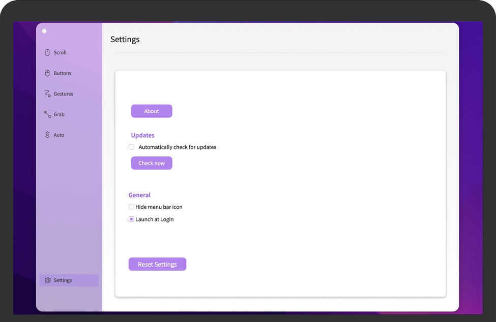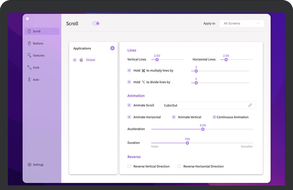 Smooze Pro for Mac 是一款平滑滚动和鼠标增强应用,可以自动滚动屏幕上的任何位置,免提,流畅的动画,抓取并滚动屏幕上的任何位置。投掷将为滚动设置动画,就像在触控板上一样。一旦启动,Smooze将添加一个带有菜单的状态栏项目,使您可以将应用程序设置为在登录时自动启动,以及禁用其自定义滚动引擎和按钮操作,并访问其选项。