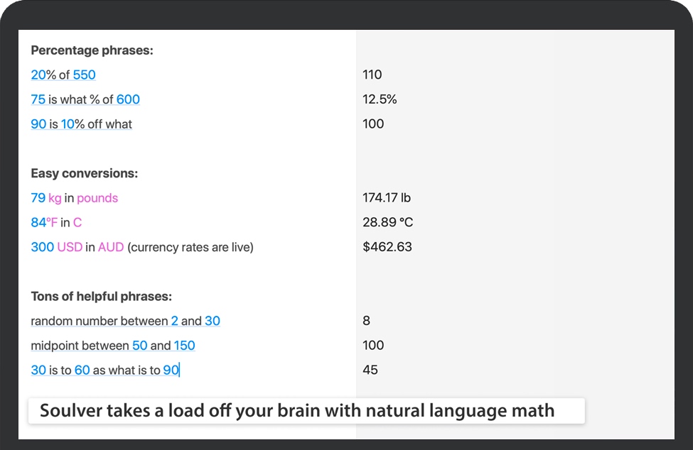 在多行的计算算式中,可以如同试算表一般灵活引用数据,加总计算、百分比计算,对于Soulver都只是小菜一碟。不仅如此,诸如货币之类的单位转换也是Soulver的拿手绝活,效率完胜试算表,更远比传统计算器来得智能。