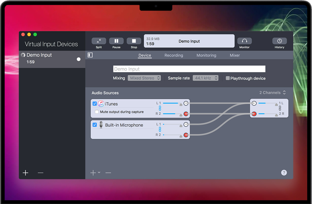 Sound Siphon for Mac 是一款可将Mac的音频输出用作音频输入设备的应用软件。您甚至可以针对特定应用程序的音频。使用它可以创建虚拟输入音频设备,将音频从一个应用发送到另一个应用。或者,直接在Sound Siphon应用程序中录制。这就像在您喜爱的应用程序中选择麦克风一样简单。Sound Siphon与核心音频一起为您的所有音频应用程序提供此功能。因此,Sound Siphon很容易集成到任何现有的音频制作环境中。