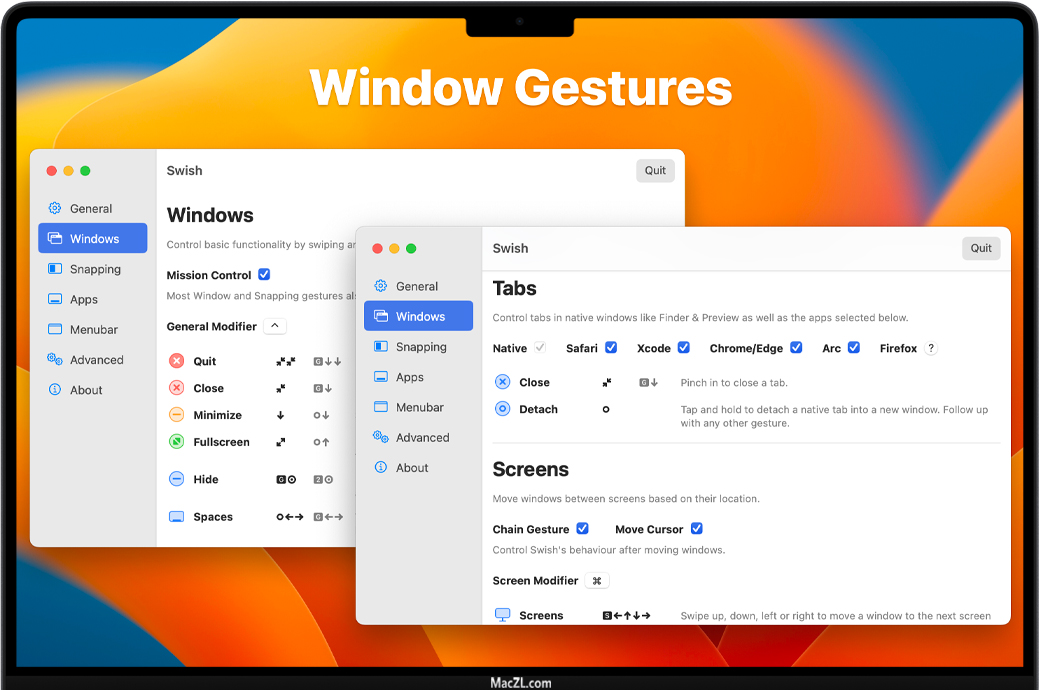 Swish 提供了 28 种直观的手势,可以增强您的工作流程并使您成为触控板高级用户。捏合退出,向下滑动以最小化,捏合进入全屏,双击隐藏等等。没有更多的点击和按钮——你用简单的动作处理一切。