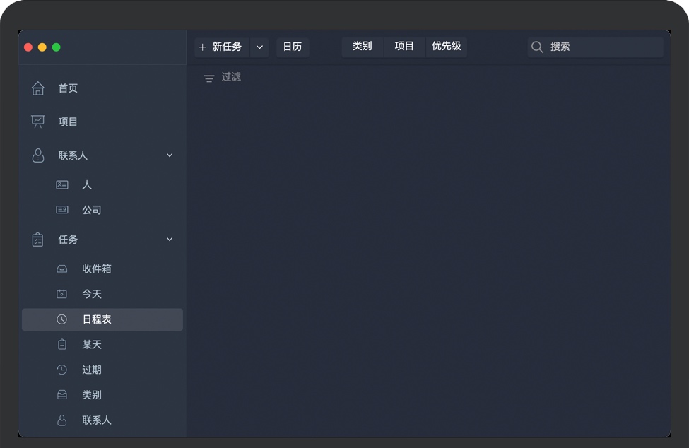 正常安排任务、添加详细信息并有序地排列在适当的文件夹中:“收件箱”、“今天”、“已安排”、“某天”、“类别”、“已委派”、“未完成”、“完成”