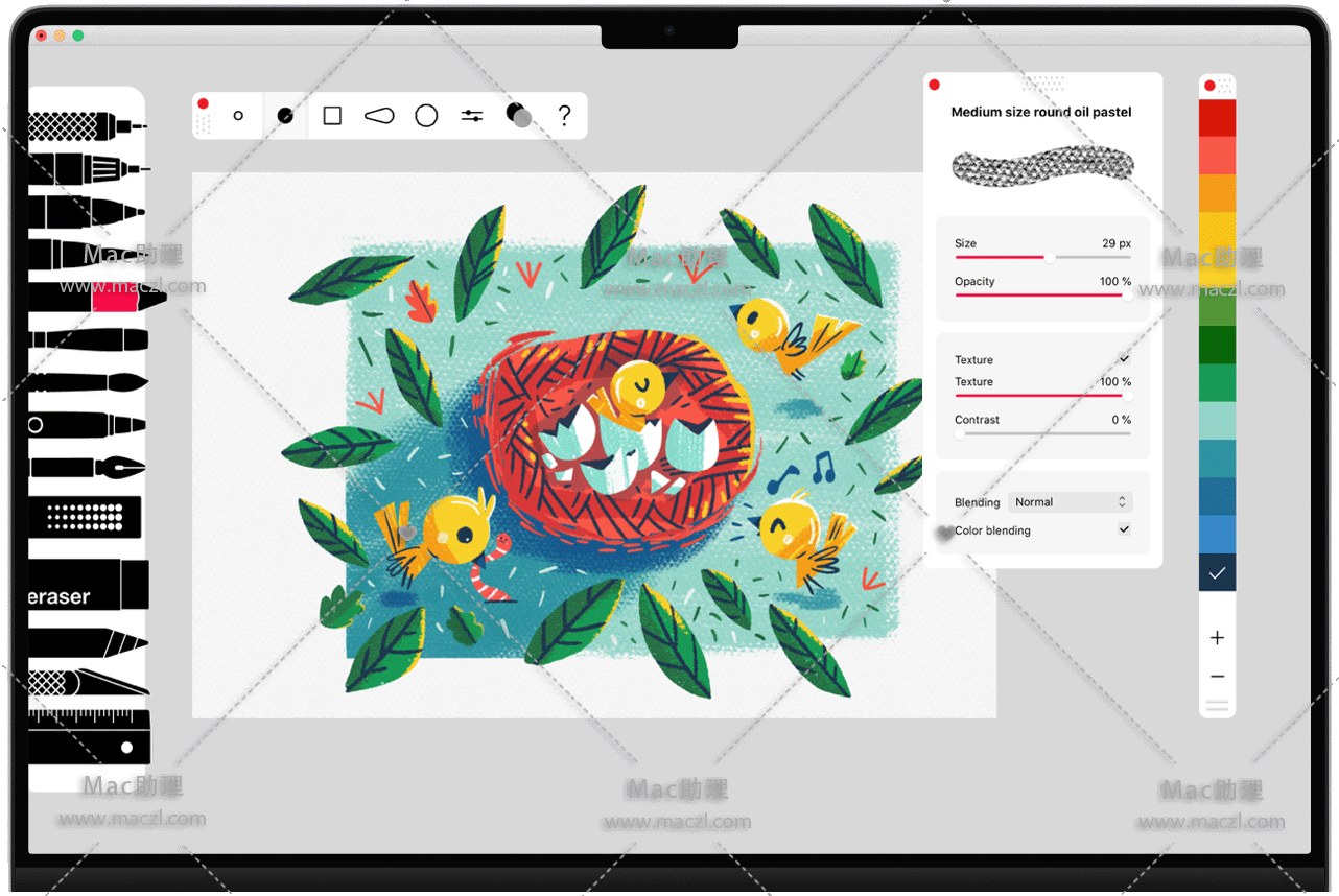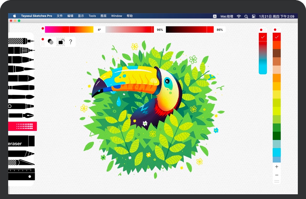 Tayasui Sketches Pro for Mac 是一款强大的绘图程序,可以帮您绘制漂亮的图画,我们坚持不懈地努力,不断改进 Sketches 画笔,给您带来最逼真的绘图和绘画工具。20 多款超真实的工具,极其真实的水彩湿画笔,智能画笔编辑器,颜色拾色器,导入照片,支持手写笔,Sketches 界面在设计时充分考虑了手写笔的需求,所有工具都支持压力,Sketches Pro支持导出为 psd 文件,是 Mac 上功能最全面且非常易于使用的绘图应用。