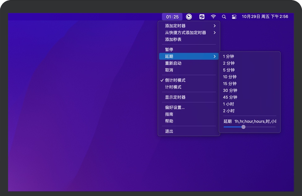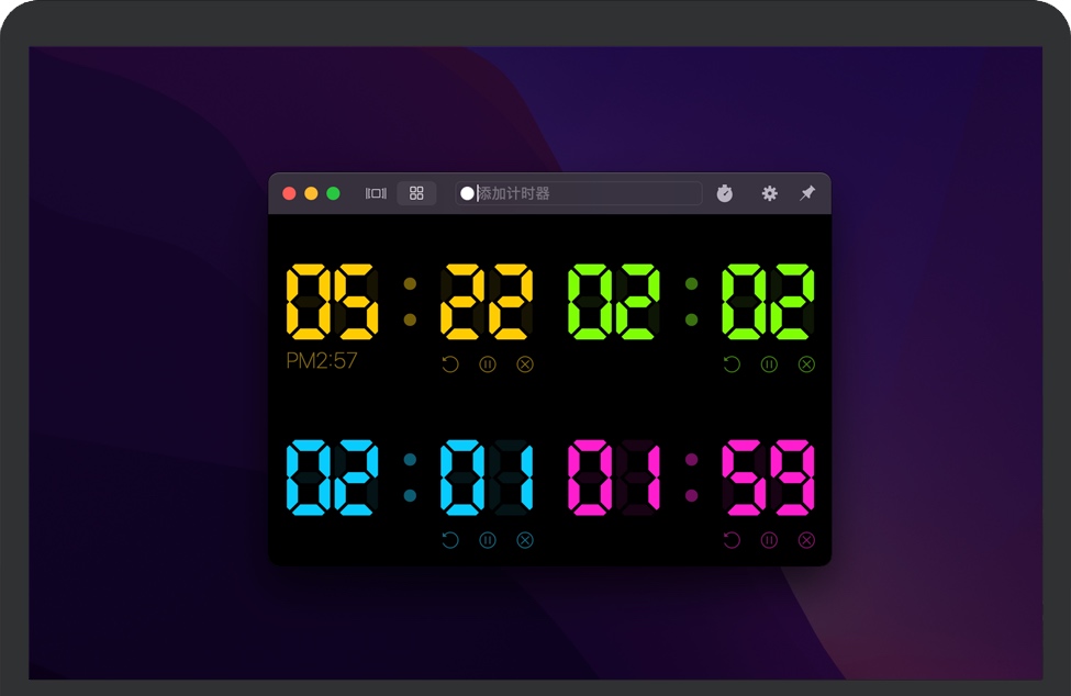 Timer RH PRO for Mac 是一款强大的定时器应用。RH Timer Pro拥有计时、倒计时、声音警报等功能。非常灵活的创建计时器方式:通过在窗口右键选择创建、通过向下拖拽菜单栏图标创建、通过在主窗口的输入框中输入快速指令创建。可以对计时器进行颜色设置、重复、暂停、快进快退等操作。
