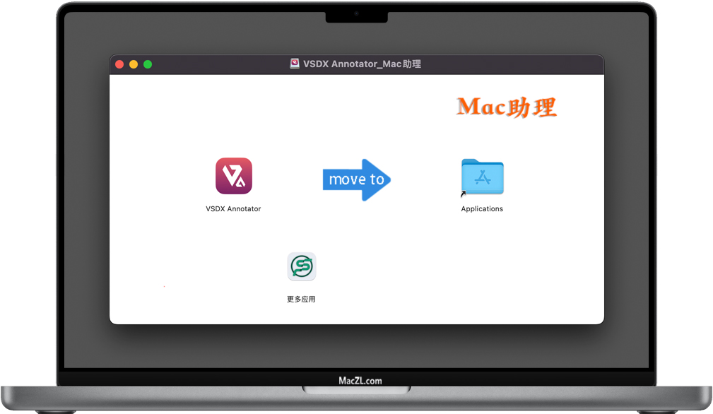 VSDX Annotator软件安装包下载完成后,打开软件包如上图,请参照 苹果电脑mac拖拽安装软件 进行安装即可。