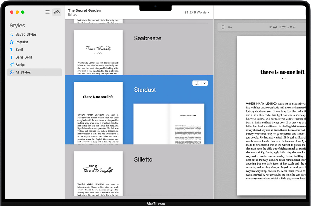 浏览Vellum的书籍样式以找到最适合您的书籍的样式。当您这样做时,Vellum会将您的选择应用于每个章节(即使您添加了新章节)。