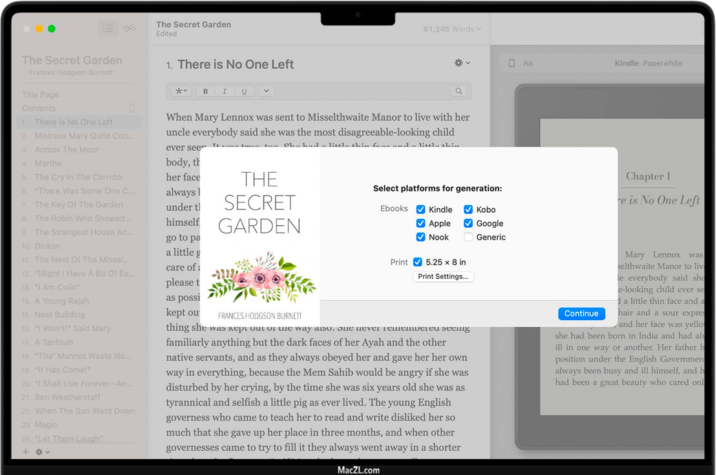 Vellum for Mac 是一款电子书生成工具,可让您轻松地从文本手稿或在应用程序中从头开始创建电子书。Vellum创建仅适用于macOS的精美书籍、精美的印刷内饰、精美的电子书、印刷版和电子书版均包含自定义首字下沉和装饰性装饰等经典元素。从几个选项中选择合适的样式,查看成品的即时预览,并方便地生成和再生电子书,只需一次点击,就能为我们制作出iBook/Kindle/Nook格式的电子书。
