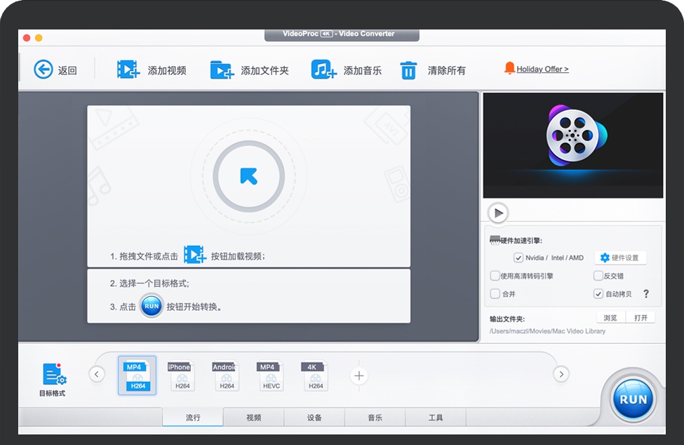 MacX Video Converter Pro在处理高效视频编码/H.265中处于领先地位。硬件加速的HEVC转码可帮助4K视频以无与伦比的速度进入屏幕。在HEVC工作负载下,不再有挂断电话,漫长的等待时间或较高的CPU使用率。